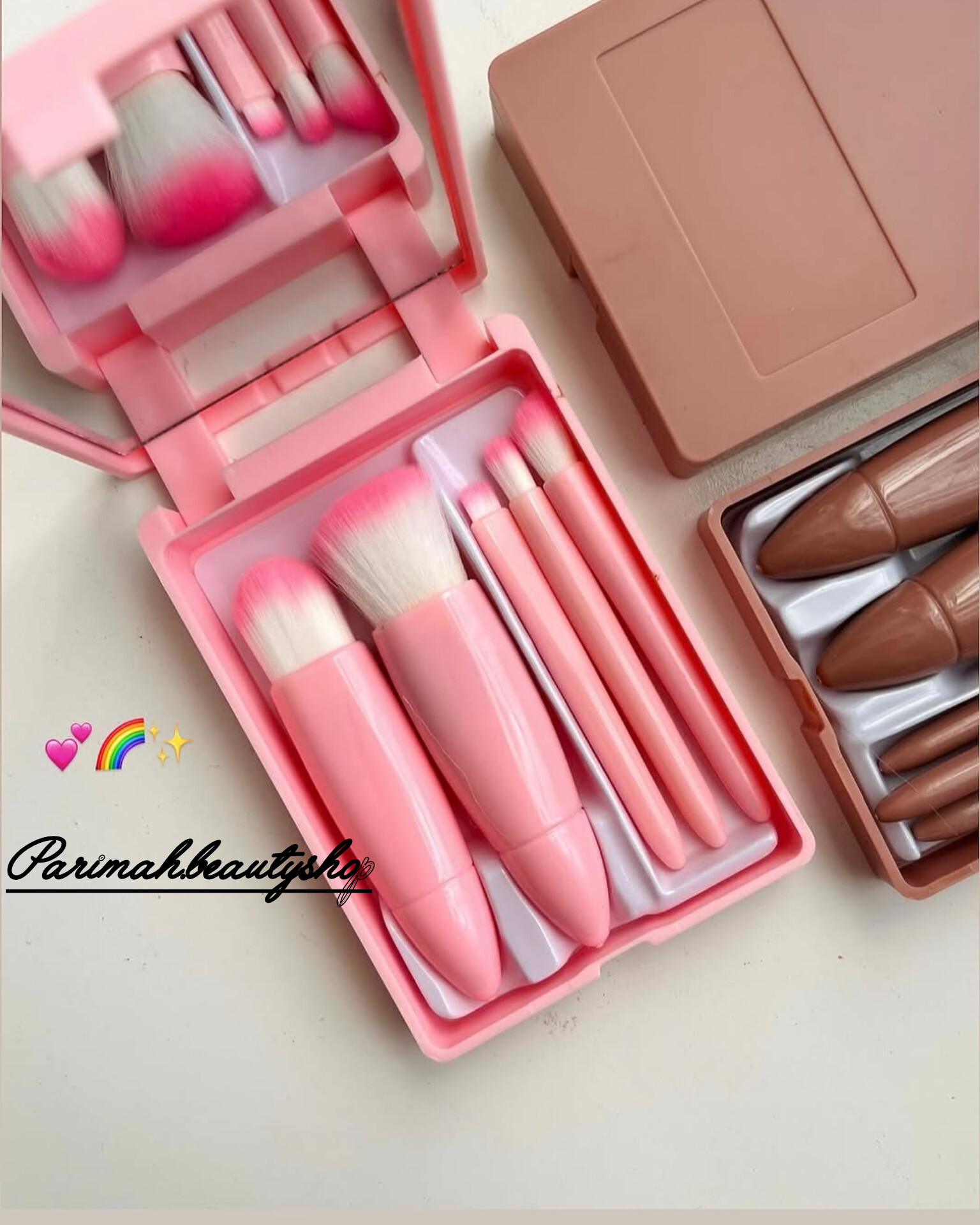 براشها یکی از پرکاربردترین ابزارهای آرایشی بوده که لازم است هر خانمی یکی از این براشها را در کیف لوزام آرایش خود داشته باشد. این ست براش شامل 5 عدد براش و آینه در درب محصول است که هرکدام کاربرد خاص خود را دارد. براشهای بزرگتر که موهایی پر پشت، بلند و نرم دارند، به راحتی لوازم آرایش پودری را روی پوست صورت پخش میکنند. اگر از این براش برای پخش پنکیک و رژ گونه یا پودرهای فیکس و بیک استفاده کنید نتیجه نهایی آرایش شما خیلی طبیعی و زیبا خواهد شد. 3 عدد براشهای کوچک مخصوص آرایش چشم میباشند. این 3 براش شامل یک براش کوچک با موهای زاویه دار میباشد که برای سایه زدن نواحی گوشه چشم و برای خطی کشیدن سایه چشم استفاده میشود. 2 براش دیگر سر گرد هستند که از براش سر گرد بزگتر برای محو کردن و ترکیب کردن رنگها استفاده میشود و از براش سرگرد کوچک تر برای انجام ریزکاریهای سایه استفاده میشود.
